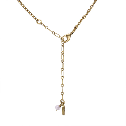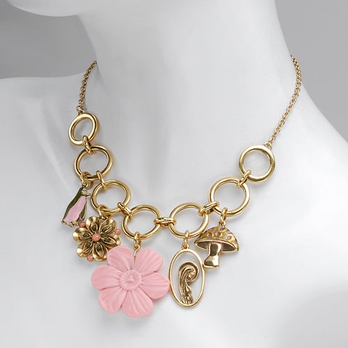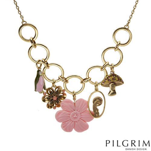 Lovely PILGRIM necklace with flower pendant and charms made in yellow base metal and pink enamel. Gift box included.